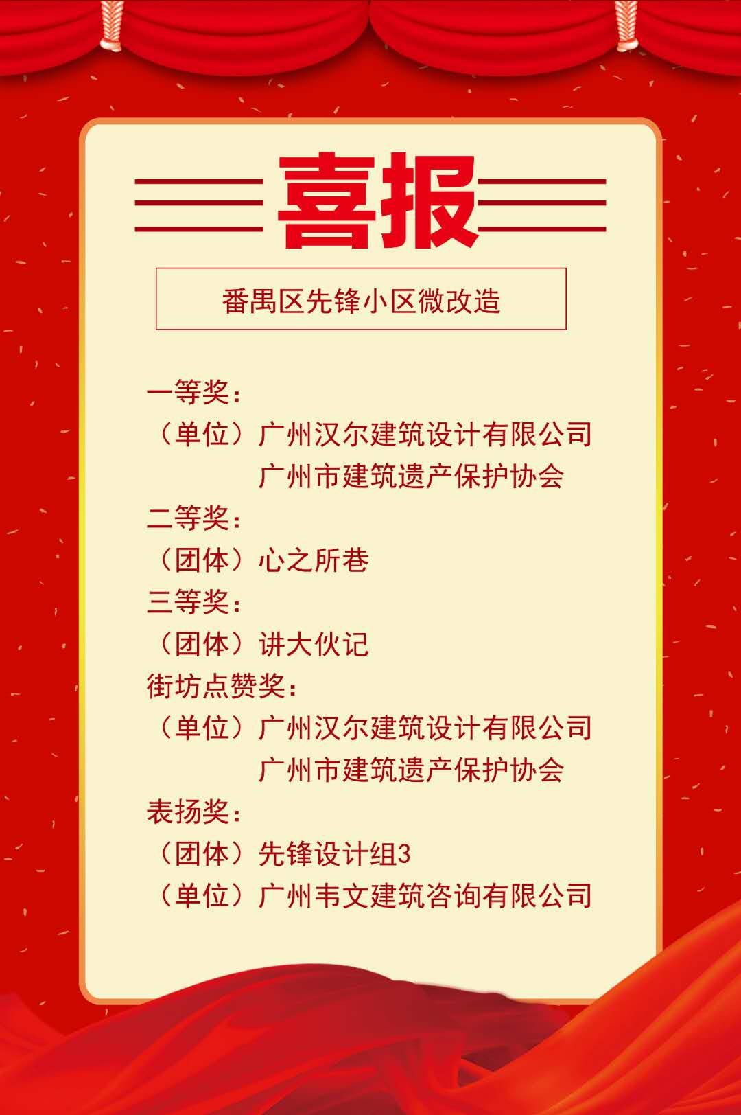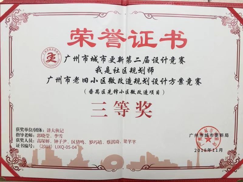 2018年8月-11月,在我院郭晓莹老师、李雪老师的指导下,城乡规划151班高琛妍、钟子尹、欧倩鸣、罗巧靖、梁芊芊同学,参加了广州市城市更新局举办的“广州市城市更新第二届设计竞赛——我是社区规划师”广州市老旧小区改造规划设计方案竞赛,最终荣获三等奖。