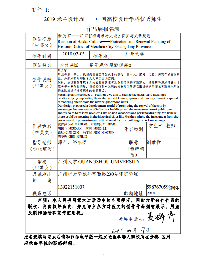 2019年4月18日,我院漆平老师和骆尔提老师共同指导“2018年南粤杯6+1联合毕设”作品《聚.万家——广东省梅州市历史城区保护与更新规划》获“2019米兰设计周——中国高校设计学科优秀师生作品展”广东赛区第一名。目前选送到北京,代表国家参加米兰设计周。