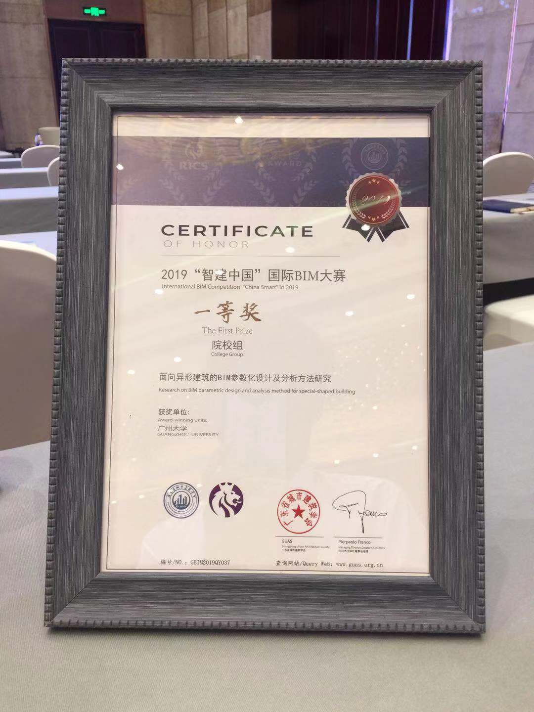 为了推动新时代中国建筑新技术的国际融合,促进城乡建设高质量发展,广东省城市建筑学会在广东省住房和城乡建设厅的政策指导下,联合英国皇家特许测量师学会(RICS)、英国皇家特许建造学会(CIOB)、美国城市土地学会(ULI)、美国建筑师学会上海分会(AIA)发起“智建中国”国际BIM大赛,旨在推进BIM技术在建筑各领域的深度应用,促进建筑业转型升级,提升建筑信息化和工业化水平、提高工程质量和投资效益,并加快建筑业新技术与国际标准融合。我院建筑环境与数字化模拟实验室的兴趣爱好者团队,提交了他们的探索成果《面向异形建筑的BIM参数化设计及分析方法研究》,喜获院校组一等奖!。2019年11月8日,以“BIM智建、创新思维、深度认知”为主题的“2019智建中国”国际BIM大赛颁奖典礼及峰会在广州铂尔曼酒店举行,团队代表我院2017级研究生李世茂上台接收了大会颁奖。
